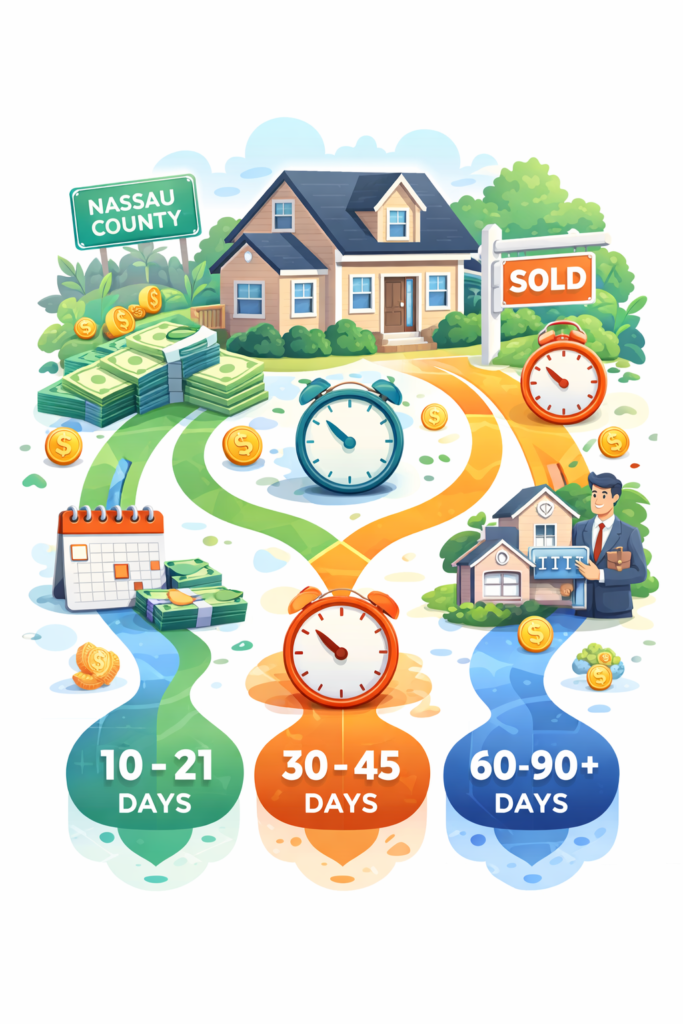 Yes, significantly. A cash sale eliminates the three most common delay sources in Nassau County: buyer financing fallthrough, lender appraisal issues, and the extended mortgage processing period. The result is a timeline of 10 to 24 days versus 60 to 90+ days for a traditional listing — a difference of 6 to 10 weeks.